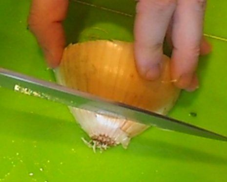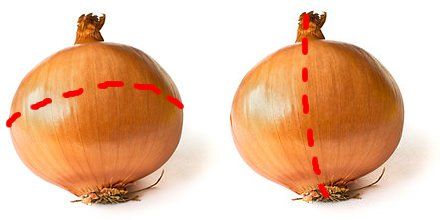 Onions are one of those ingredients in recipes that make people cower in fear. First of all, they're a perfect sphere which makes a lot of people worried about the onion rocking in mid-cut and the knife slipping. Second, onion juice has sulfur in it, which when it evaporates irritates your eyes and causes them to water. That's why onions make you cry. The trick to onions is to cut them right, cut them fast, and cut them clean.