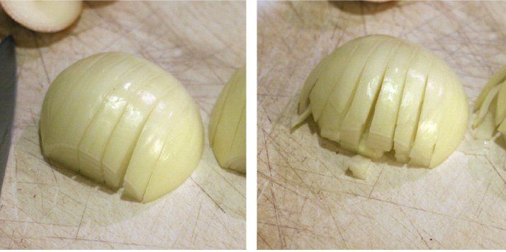 Telling it to you in words and pictures is really difficult, so I took the time, while I was making Ratatouille, to take some video of me cutting an onion. Hopefully, watching it will help you understand what's going on. It's 2 minutes long, but it includes the whole onion, so you can stop anytime you like.