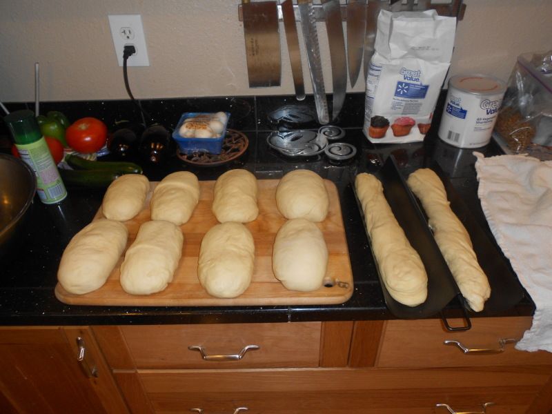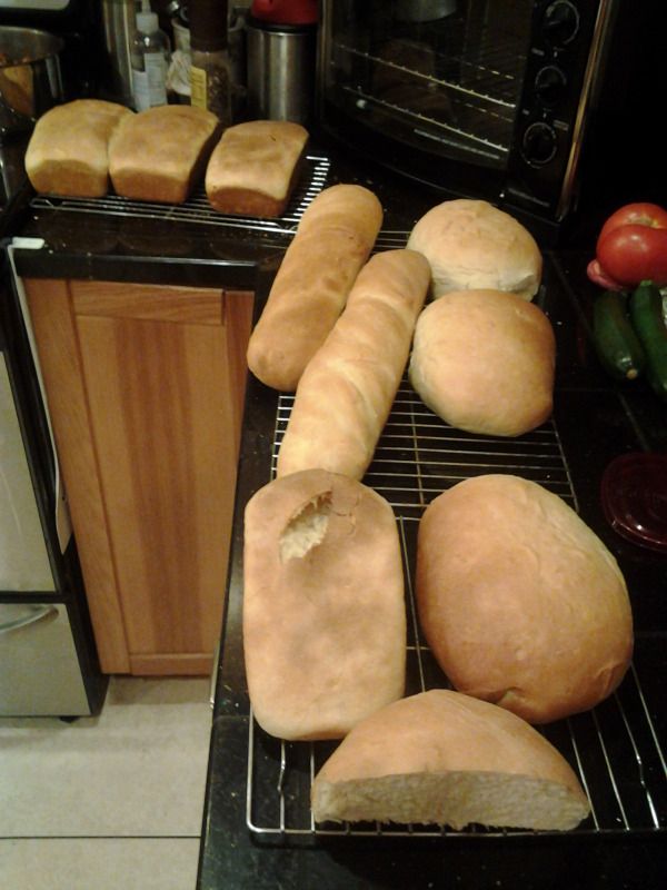 We made 5 pounds of flour worth of bread and came up with 9 loaves of bread, all in different shapes: