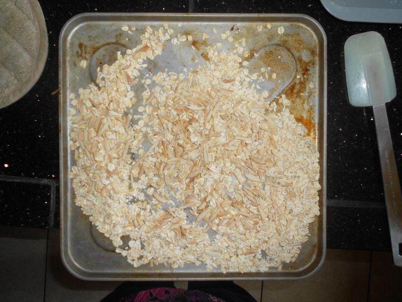 Spread the oats and almonds (or sunflower seeds) out on a cookie sheet and put them under your oven's broiler for 5 minutes or until slightly browned and toasted. |