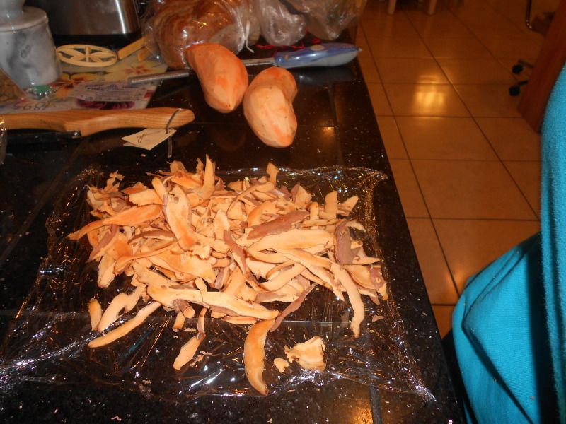 4. Peel all the vegetables you need, keeping the peelings on the saran wrap. If you miss, just pick the pieces up and put them back on the wrap.